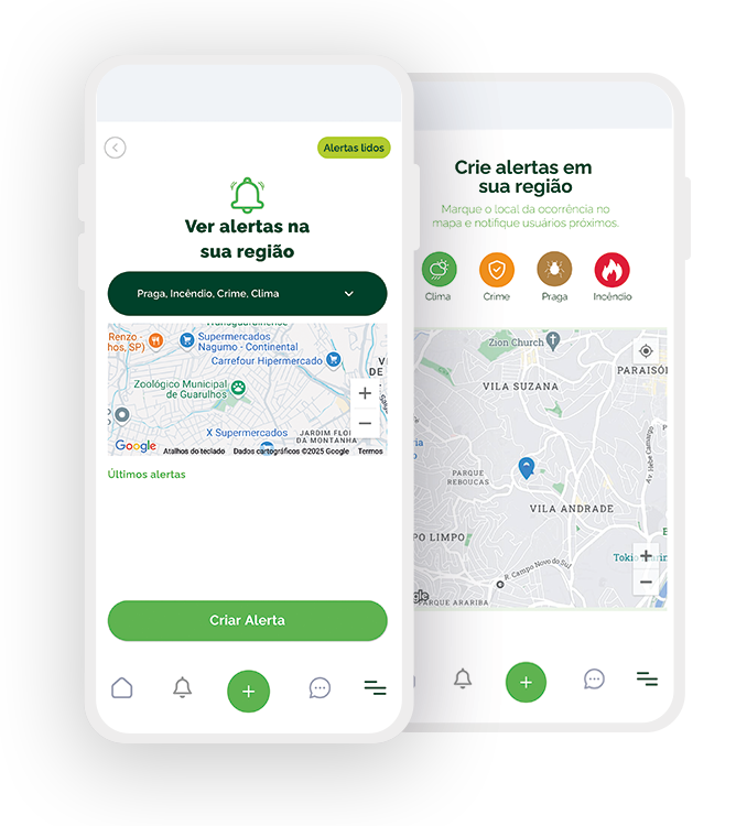 Crie e receba alertas personalizados da sua região sobre pragas, incêndios, clima e outras ocorrências relevantes.