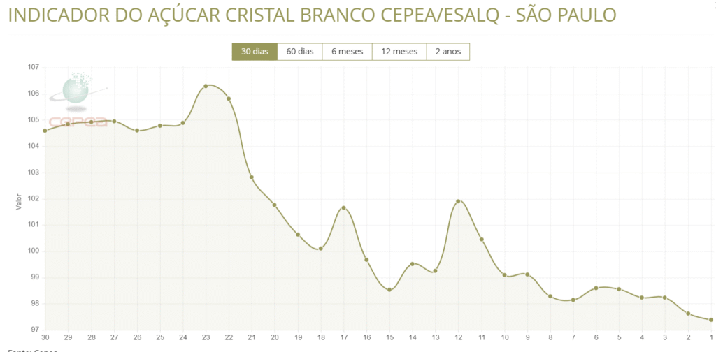 | INFORMAÇÕES COMPLEMENTARES | A) Caso os valores coletados junto ao produtor sejam expressos em dólar americano, realiza-se a sua transformação em reais, empregando-se a taxa de câmbio Ptax (venda) de fechamento do dia.B) Os indicadores de preços elaborados pelo Cepea são baseados em pesquisa do próprio Centro, realizada diariamente junto a participantes do mercado a que se referem. O procedimento desenvolvido para o Indicador de Açúcar Cristal ESALQ/BVMF visa captar e trabalhar informações que resultem em indicadores que expressam o valor mais próximo dos preços efetivamente negociados na exportação de açúcar cristal através do porto de Santos. |